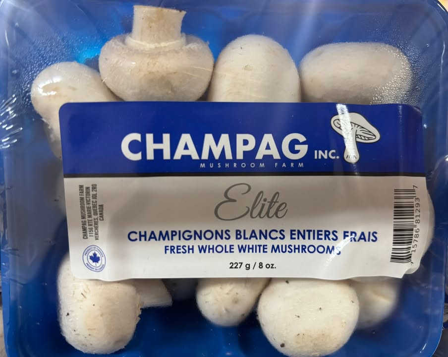 Champignons blancs entiers à 1.50$ (227G) - 150 unités de disponibles (Ailleurs jusqu’à 2.99$ !)