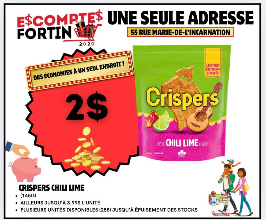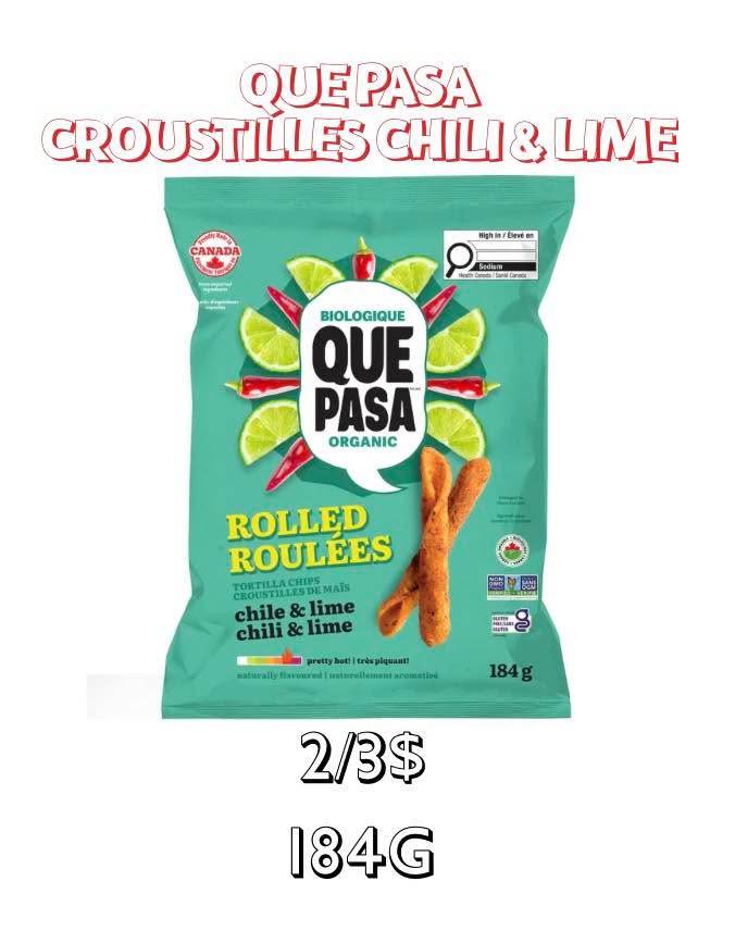 NOUVEL ARRIVAGE DE CROUSTILLES CHILI & LIME QUE PASA(184G) 2/3$ - Ailleurs jusqu’à 6.29$ l’unité Seulement 570 unités disponibles , dépêchez vous de venir nous voir !