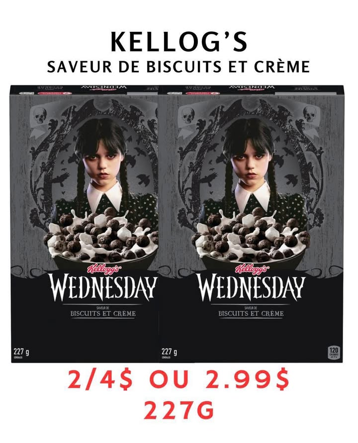 NOUVEL ARRIVAGE DE CÉRÉALES Et oui la fameuse série de Mercredi Adams Venez vite quantité limitée Ailleurs jusqu’à 7.29$