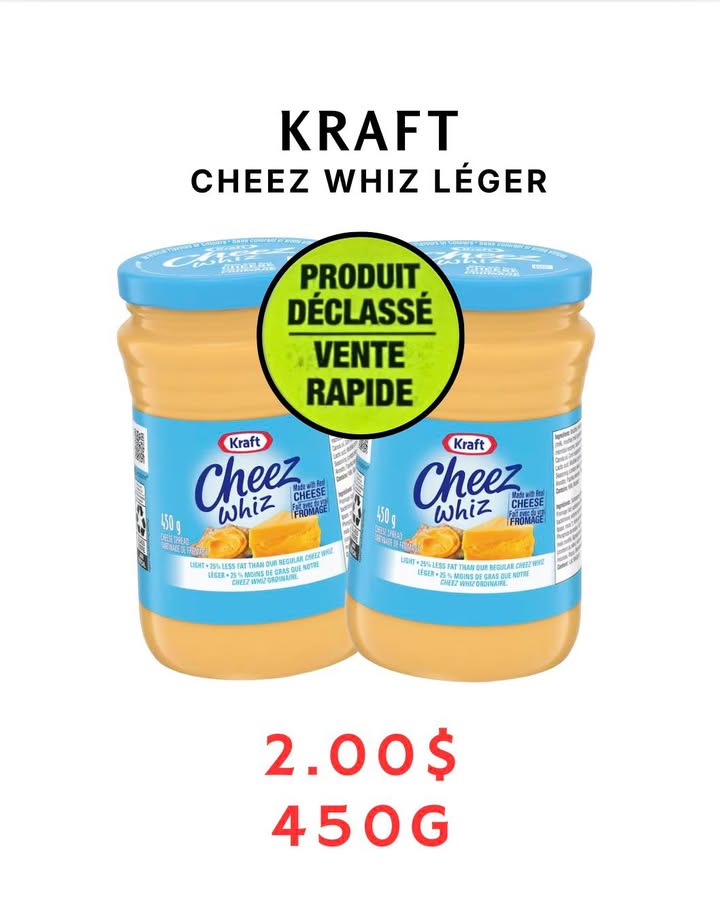 NOUVEL ARRIVAGE DE CHEEZ WHIZ - DÉCLASSÉ MAIS ENCORE TRÈS BON Vente rapide - Ailleurs jusqu’à 7.49$ Quantité limitée