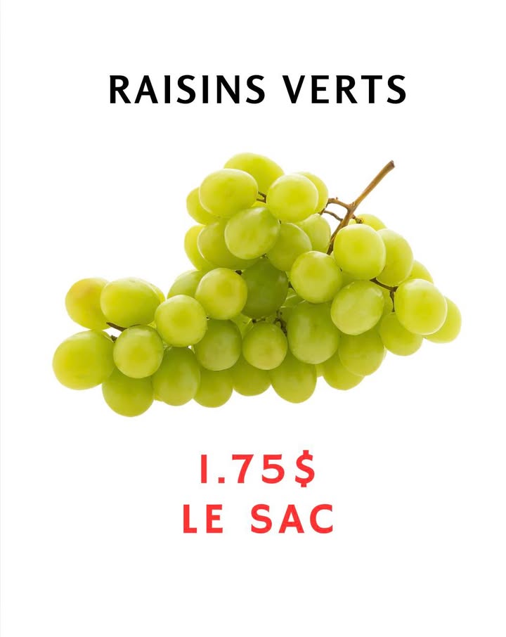 NOUVEL ARRIVAGE DE RAISINS VERTS - 21 JANVIER 2026 Super offre Ailleurs jusqu’à 6$ le sacQuantité limitée